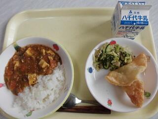 献立:ごはん カレー豆腐 牛乳 さつまいもの包み揚げ ごまドレサラダ