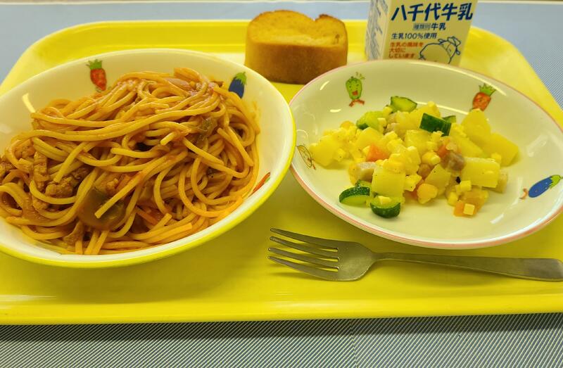 献立は、ナポリタン、牛乳、マセドアンサラダ、ハニーレモンラスク、です。