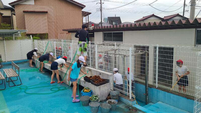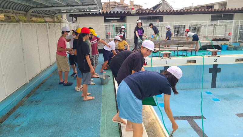 午前中に保護者の方々がプール内部をピカピカにしていただいたので、6年生は、更衣室、シャワー、体洗槽、プールの周囲を中心に清掃しました。