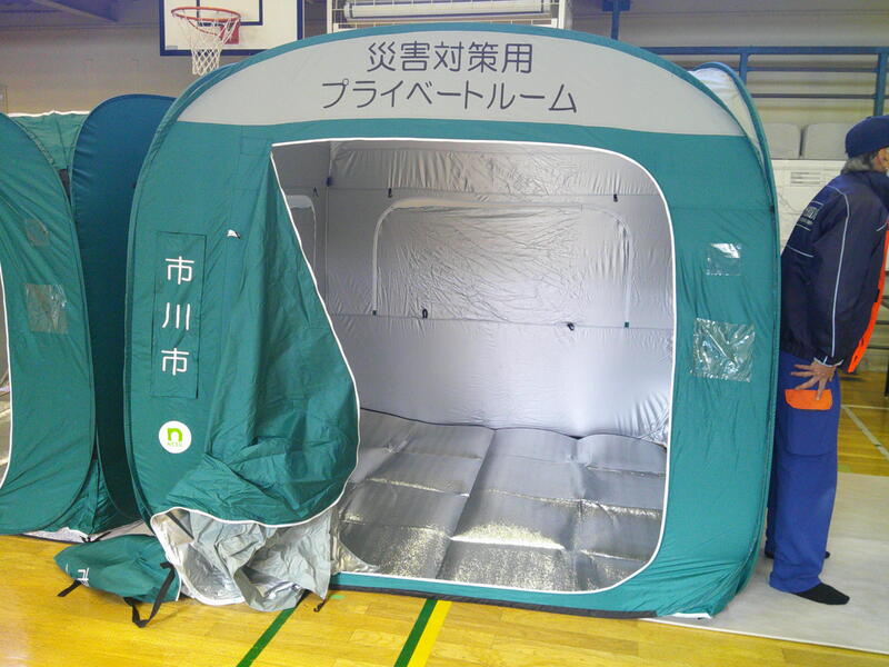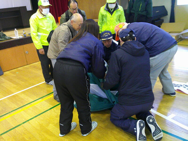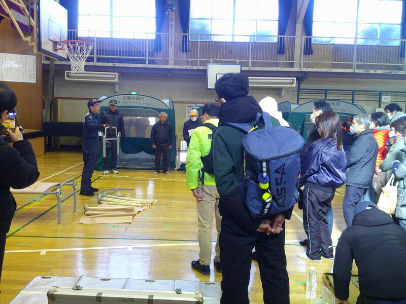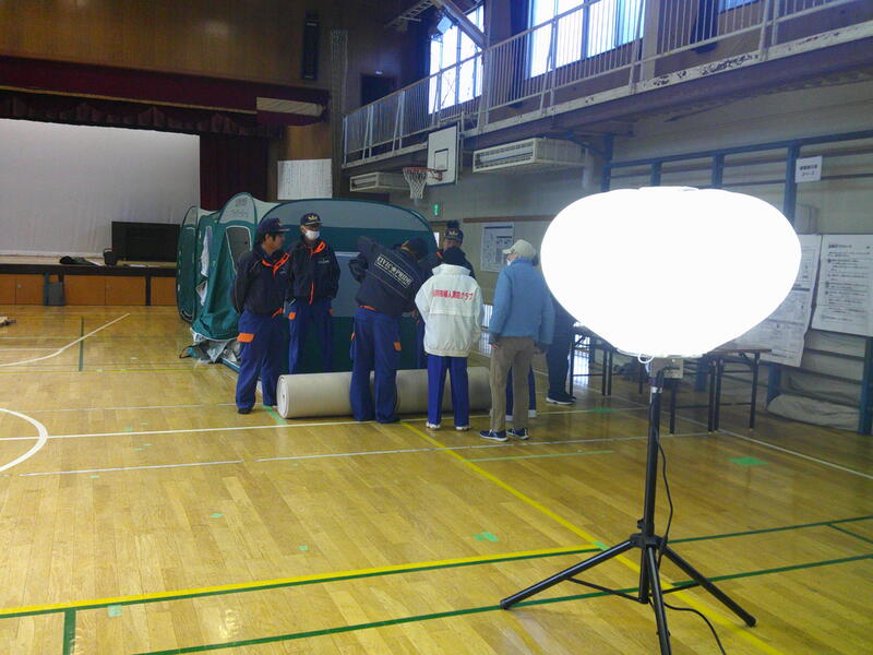 訓練では、6班に分かれ、総務班(避難所受付・記載台)、情報班(避難所Wi-Fi・情報スペース・ラジオ)、施設管理班(点手・ライト・ソーラーパネル)、要配慮班(語学サポート・福祉・ベッド)、保健・衛生班(担架・トイレ・ゴミ置き場)、食糧・物資班(アルファ米・水)の訓練を行いました。