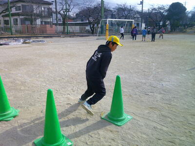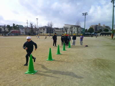 上の写真のように、子どもたちが自分たちでターンを工夫しています。マラソン大会でご覧になった方はいらっしゃると思いますが、いわゆる「鶴谷ターン」(折り返し点に背を向けてターン)と呼ばれ、プロのランナーも使っています。これを知識としてではなく、「こうやったら早いんじゃない?」という意見が子ども同士で交わされて使っているそうです。とてもいいですね。