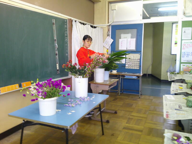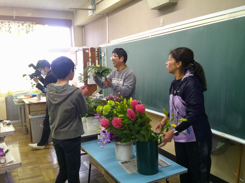 6年生が華道の先生をお招きして生け花教室を行いました。