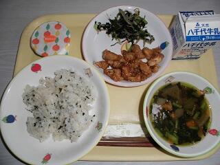 献立:わかめご飯 牛乳 大根のそぼろ汁 チキンチキンごぼう おひたし みかんシャーベット