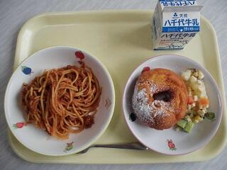 献立:スパゲティボロネーゼ 牛乳 マセドアンサラダ かぼちゃドーナツ