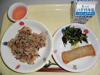 献立:豚そぼろひじきご飯 牛乳 春巻 磯香和え アセロラゼリー