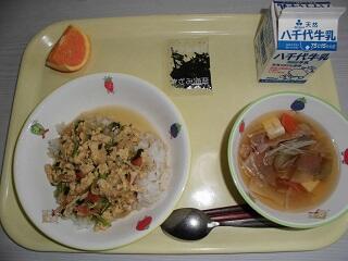献立:あぶたま丼 牛乳 けんちん汁 清美オレンジ