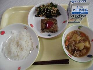 献立:ご飯 牛乳 新じゃがの含め煮 和風ミートローフ 納豆和え