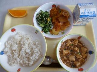 献立:ご飯 牛乳 麻婆豆腐 ほうれん草とコーンのナムル 野菜チップ 清美オレンジ