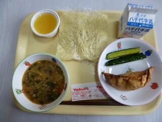 献立:みそラーメン 牛乳 揚げぎょうざ 中華きゅうり オレンジゼリー