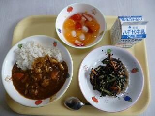 献立:シーフードカレーライス 牛乳 ひじきのマリネ フルーツ白玉