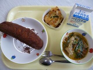 献立:ココア揚げパン 牛乳 ワンタンスープ ポテトのラザニア