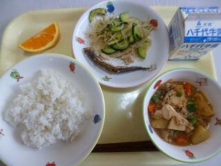 献立:ご飯 牛乳 生揚げの肉みそ煮 焼きししゃも 春雨サラダ 清美オレンジ
