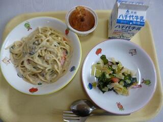今日はクリームスパゲティです。キノコの苦手な子もおいしく食べてくれるといいですね。ケーキはレーズンケーキです。レーズンが食べなれていなかったり、苦手だったりする子も多いと思います。給食を食べて、好きになってくれるとうれしいです。おいしく作りました。