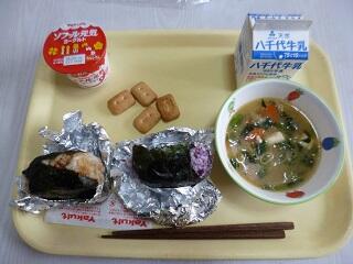 献立:おにぎり(おかか・ゆかり) 牛乳 豚汁 かんパン ヨーグルト