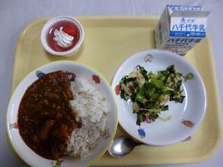 献立:ハヤシライス 牛乳 海藻サラダ いちごゼリー