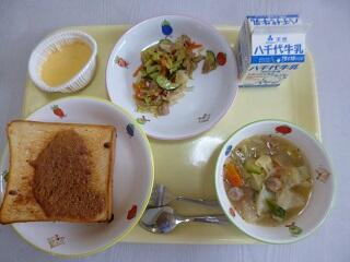献立:きなこトースト 牛乳 ポトフ 焼肉サラダ むしプリン