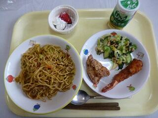 今日は人気のみそラーメンです。スープは給食室の手作りです。一度に袋のめんをおわんに入れると食べづらいので半分ずつ入れましょうと伝えています。中華きゅうりも人気メニューです。きゅうりを切って中華味のたれにつけるだけです。ご家庭でも試してみてください。