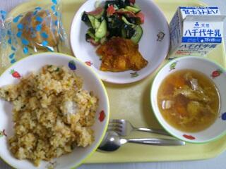 献立:ガーリックライス 牛乳 オニオン卵スープ タンドリーチキン イタリアンサラダ シューアイス