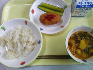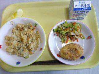 献立:ガーリックライス 牛乳 ツナカレーコロッケ 焼肉サラダ りんご