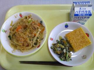 献立:やきうどん 牛乳 ひじきとツナのサラダ カステラ