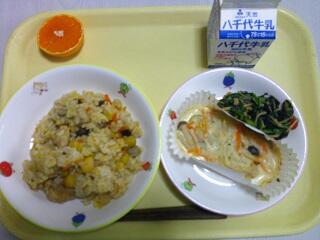 秋も終わりの時期になりました。木枯らしがいろいろな鮮やかな葉っぱや木の実を吹き寄せたイメージのごはんが吹き寄せご飯です。たらはこれから旬を迎える魚です。みそマヨネーズと野菜でオーブンで焼きました。磯香和えの小松菜は、地元市川産です。寒くなってきました。風邪が流行っています。元気な人は、しっかり食べて抵抗力をつけましょう。具合の悪い人は、消化の良い食べ物を食べて、家で、ゆっくりしましょう。