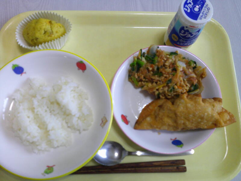献立:ご飯 飲むヨーグルト 揚げ餃子 切り干し大根の納豆和え スイートポテト