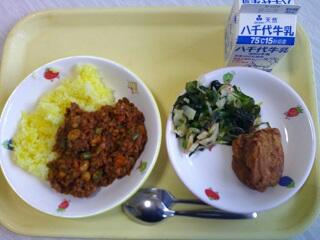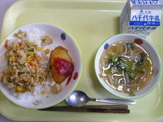 献立:チリコンカンライス 牛乳 鶏のから揚げ 海藻サラダ
