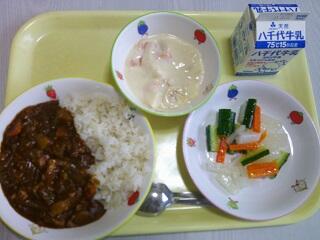 スティックサラダの大根はこれから旬を迎える野菜です。ハヤシライスの口直しにぴったりです。フルーツヨーグルトにはみかん、りんご、バナナが入っています。