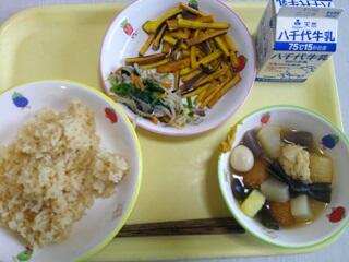 11月29日(水)の給食 投稿日時 : 2023/11/29 編集長 献立:茶飯 牛乳 おでん ごしき和え いもかりんとう 寒くなってきたのでおでんのおいしい時期になりました!おでんには茶飯がよく合いますね。口直しの芋かりんとうも旬のおかずです。さつまいもは千葉県の特産物ですね。