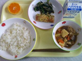 今日はちょっと濃いめのルーのドライカレーです。急に寒くなったからか、風邪やインフルエンザがはやってきました。柿はビタミンCたっぷりで、風邪の予防に効果があります。元気な人はしっかり食べて、病気に負けない体を作りましょう。