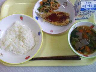 秋も終わりの時期になりました。木枯らしがいろいろな鮮やかな葉っぱや木の実を吹き寄せたイメージのごはんが吹き寄せご飯です。たらはこれから旬を迎える魚です。みそマヨネーズと野菜でオーブンで焼きました。磯香和えの小松菜は、地元市川産です。寒くなってきました。風邪が流行っています。元気な人は、しっかり食べて抵抗力をつけましょう。具合の悪い人は、消化の良い食べ物を食べて、家で、ゆっくりしましょう。
