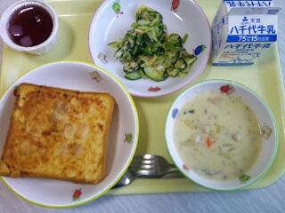 献立:アーモンドトースト 牛乳 秋のシチュー ツナサラダ ぶどうゼリー