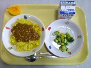献立:ドライカレー 牛乳 グリーンサラダ 柿