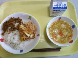 献立:ご飯 牛乳 生揚げの肉みそ煮 はたはたのから揚げ わかめともやしの和え物