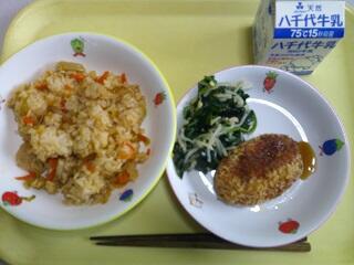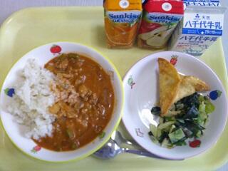 今日はコロッケをパンに塗って焼きました。コロッケパンです。カレースープはカレーのピリ辛で体が温まります。寒い日が続くと牛乳の残りが増えてきます。ミルメークがあると、味が変わって飲みやすくなります。1年生は初ミルメークで、大喜びしていました。