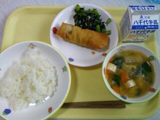 献立:ご飯 鶏団子と白菜のスープ 春巻 海苔和え