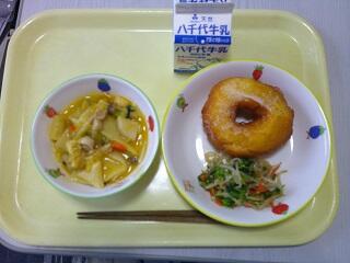 寒くなると、うどんのような温かいものがおいしいですね。今日は、山梨県の郷土料理「ほうとう」です。ほうとうは平べったいうどんとかぼちゃや野菜の入ったうどんです。食べると温まります!オレンジおからドーナツは、オレンジの香りのするドーナツです。おいしく食べてくれたようです。今日はどれも残りが少なかったです。