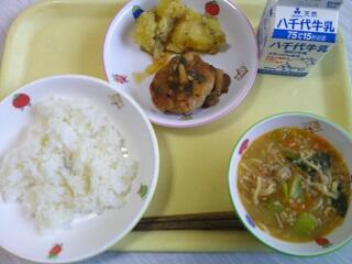 献立:ご飯 牛乳 タンタンメンスープ おろしハンバーグ じゃがバター