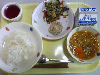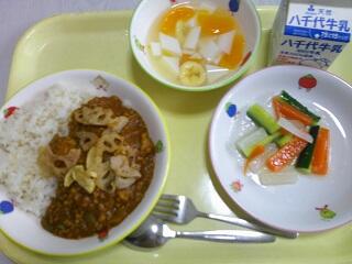 根菜とひき肉のカレーライス 牛乳 スティックサラダ 杏仁豆腐