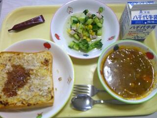 献立:焼きコロッケパン 牛乳 ひよこ豆のカレースープ グリーンサラダ ミルメークココア