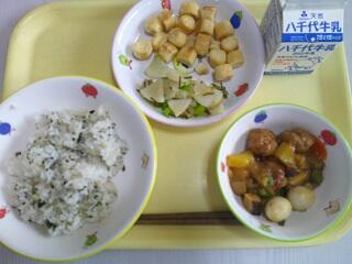 献立:わかめご飯 牛乳 肉団子のうま煮 かぶの即席漬け おふのラスク