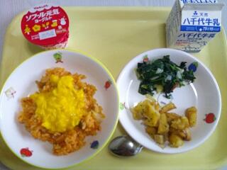 今年もあと3回で給食は終わりです。今日はセルフオムライスです。チキンライスの上に卵をかけます。今回はスクランブルエッグ風の卵をごはんにかけました。