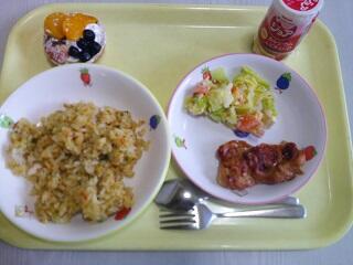 献立:ガーリックライス 飲むヨーグルト(いちご味) ローストチキン シーザーサラダ フルーツタルト