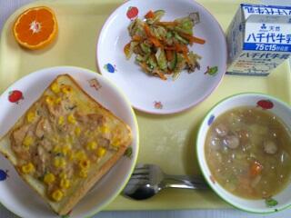 献立:ツナコーントースト 牛乳 ポトフ 焼肉サラダ 花みかん