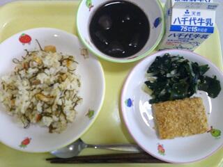 献立:昆布ご飯 牛乳 松風焼き わかめと大根のナムル 芋ぜんざい