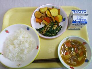 献立:ご飯 牛乳 肉じゃが 納豆和え 野菜チップ