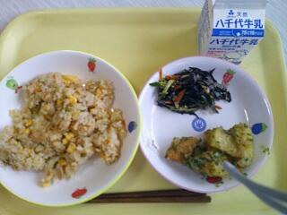 今日はツナと炒り卵の入ったご飯です。みそポテトは甘辛いみそのたれを揚げたじゃがいもにからめました。