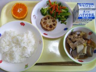 献立:ご飯 牛乳 芋煮 れんこんのはさみ揚げ ブロッコリーのからし和え 花みかん