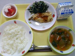 献立:あぶ玉丼 牛乳 いなか汁 いちご
