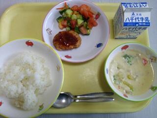 献立:ご飯 牛乳 米粉のシチュー チーズハンバーグ トマトときゅうりのさっぱり和え